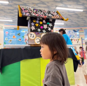 peekabooせせらぎ保育園でお隣のpeekaboo幼稚舎で夏祭りが開催されました。お兄さんお姉さんが用意してくれた遊びにりす組の子ども達は目をきらきら輝かせ興味津々!