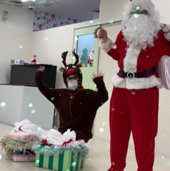 peekabooせせらぎ保育園でクリスマス会が開催。先生達の出し物を楽しんだ後は、なんとサンタさんとトナカイさんが遊びに来てくれました!