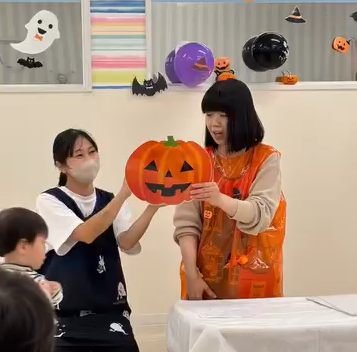 ハロウィンのお話を聞いたり、クイズに答えたり、みんなで「おばけのばけちゃま」を踊ったりと楽しそう!きりん組の子ども達は「トリックオアトリート」と言いながら各クラスにお菓子をもらいにも行きましたよ♪