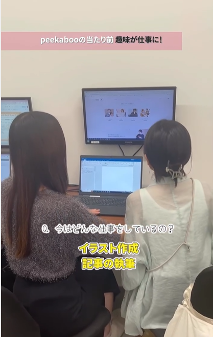 ほかにも写真が得意な方は会社PR用の写真を撮影したり、演劇が得意な方はナレーションの仕事をしたりと、さまざまな趣味や特技が仕事に繋がっています。幅広い分野の仕事がたくさんあるpeekabooならではですね!