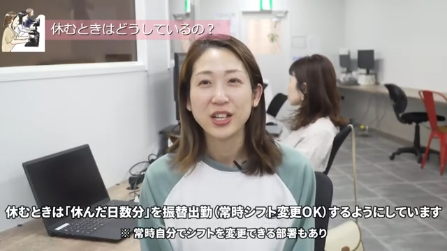 そんなときpeekabooでは、シフトの変更がいつでも可能なので、休んだ分の日数を振り替えて出勤できます(部署による)。出勤当日に休みが必要になっても、代わりの人を探す手間もないので休みやすいのもうれしいポイントです。
