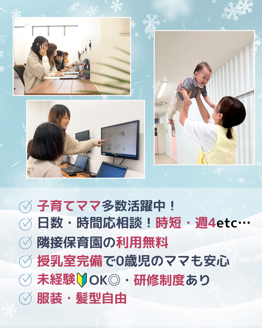 peekabooでは、子育てと仕事を両立しながらスキルアップできる環境づくりを大切にしており、多様な働き方に対応した職種を幅広く採用しています。
