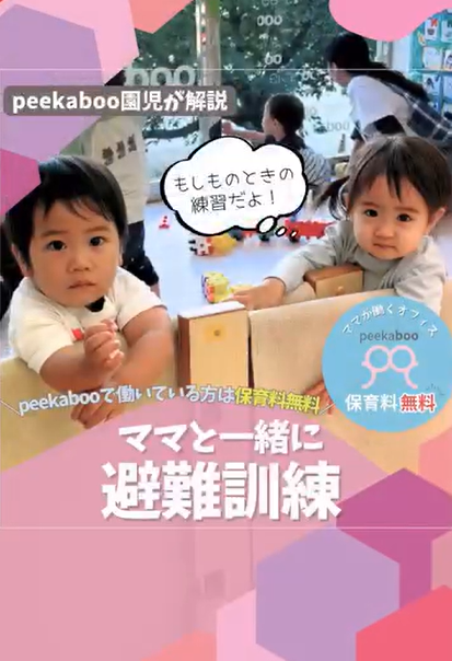 子どものそばで働けるpeekabooならではの避難訓練。なにかあってもすぐに駆けつけられるので、働くママも子どもも安心です♡