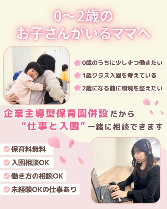 【広島市】0~2歳ママ向けお仕事相談会🌸|保育料無料の企業主導型保育園あり|中区袋町・安佐南区八木で開催