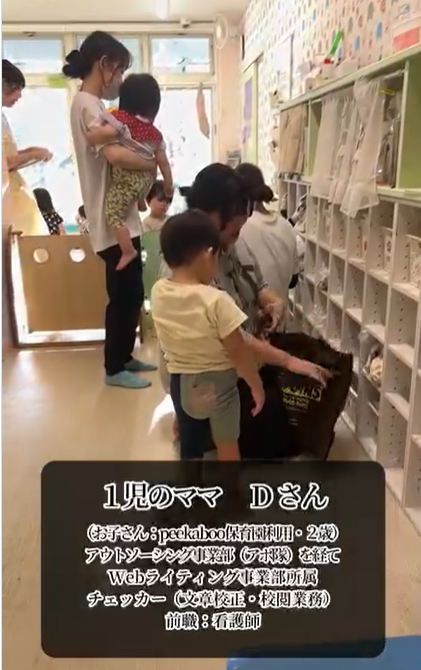 Webライティング事業部でチェッカーとして活躍されている、1児のママDさんにインタビューしました。Dさんは、2歳のお子さんがpeekaboo保育園に通っています。看護師経験を活かし、peekabooで働き始めたことで社会復帰への自信がついたんだとか。入社後は、みっちり濃い研修で正しい日本語の使い方やパソコンの知識をしっかり身につけたそうです。職場に保育園が併設されているから、送迎もラクラク!それに、職場でママ友ができたことも大きな喜びだそう。Dさんは、「仕事で得た知識を今後の人生に活かしたい」と語っています。